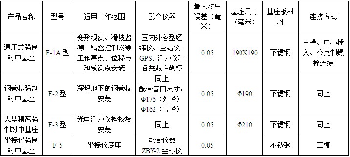 通用式基座系列产品技术先进,各型经纬仪、测距仪、全站仪、GPS和各型照准觇标通用。基座最大对中误差小于0.05毫米,使用方便,有利保护,是目前国内较完善的基座。